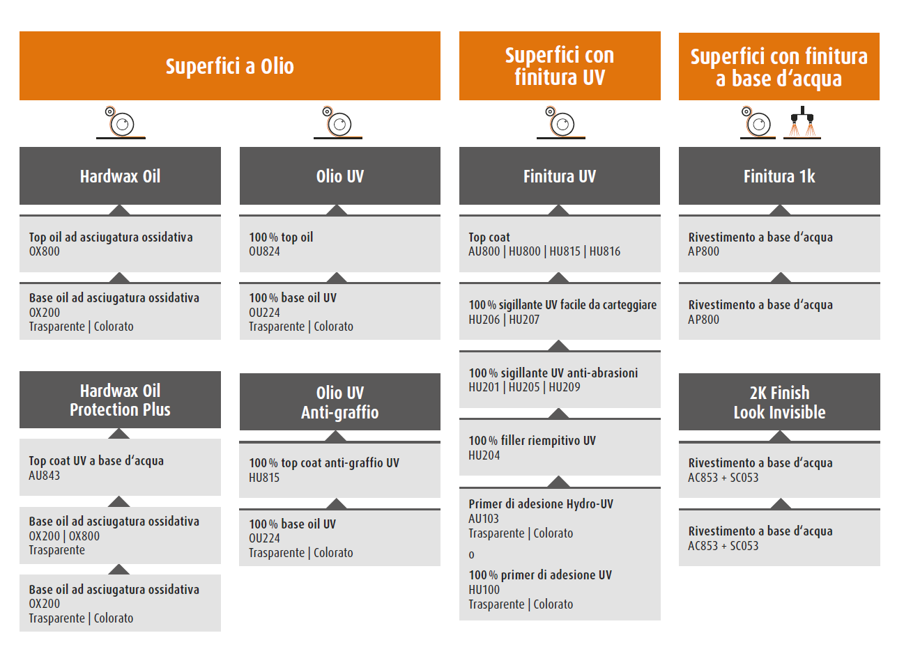 • Finiture top, per vari requisiti, come lucentezza, texture, resistenza ai graffi e agli agenti chimici